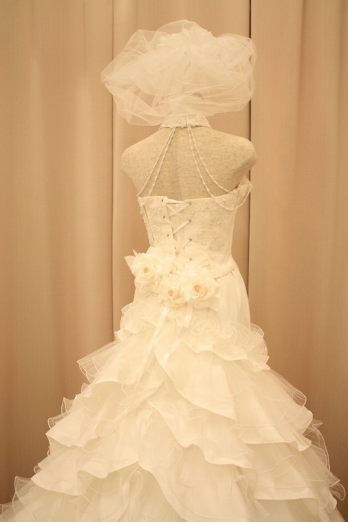 マーメードスタイルでありながらもかわいらしさを演出してくれるデザイン。 トップスの身頃の斜めについたフリルが、スリムに見せる効果アリ! トレーンはプリーツ加工を施したチュールがポイントに。 おそろいのボリューム感のあるヘッドドレスや、パールチョーカーでキュートにデコレーション。 レンタル価格:¥77,000